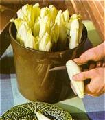 Als de wortelen uit de koeling worden gehaald, begint het tweede jaar van de witlofplant. De pennen worden in grote houten bakken met hun voetjes in het water gezet in een donkere ruimte. Er beginnen weer bladeren aan de wortel te groeien, maar omdat het donker is, blijven de bladeren wit en blijven ze dicht op elkaar zitten. |